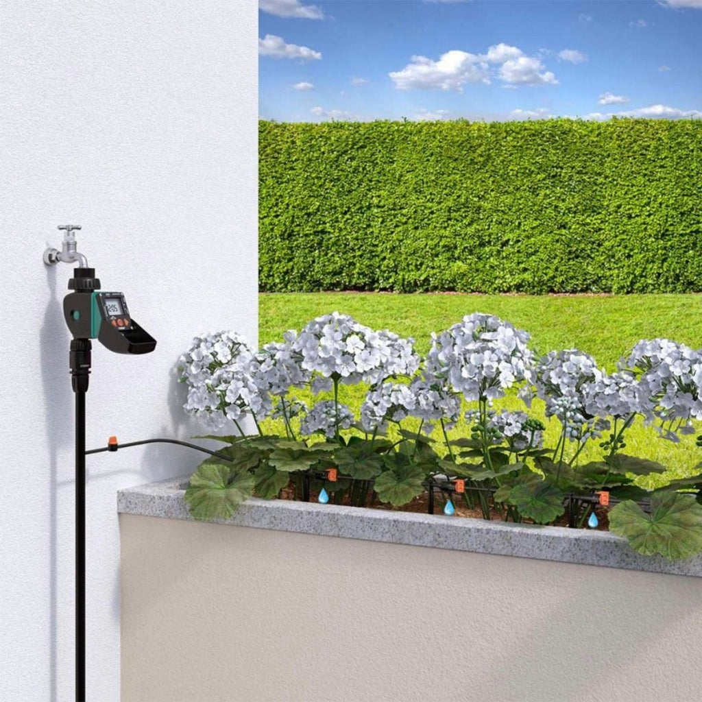 The Claber 8428 Aquauno Video-2 Water Timer is an innovative irrigation controller designed for outdoor use, ensuring your plants receive the optimal amount of water they need to thrive. Manufactured in Italy, this reliable water timer brings efficiency and convenience to your gardening routine. Featuring an intuitive programming system, the Aquauno Video-2 lets you set up to two watering cycles per day with just three buttons. Its flexible scheduling options enable you to customise each cycle, choosing durations from 1 minute to 23 hours 59 minutes, catering to your garden's specific needs. Additionally, this water timer allows you to select specific days of the week for watering, ensuring a consistent irrigation schedule. Designed for easy installation, the Aquauno Video-2 is also fully watertight, ensuring durability and reliability in varying weather conditions. Powered by a single 9V alkaline battery (not included), it boasts an operating pressure range of 0.5 to 10 bar, making it suitable for various water supply systems. Enhance your gardening experience and take the hassle out of watering with the Claber 8428 Aquauno Video-2 Water Timer, a perfect combination of functionality and quality.