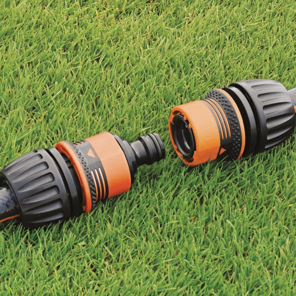 The Claber 8602 Two-Way Hose Pipe Connector connects two hoses in series using Quick-Click couplings. Join two hoses to achieve the desired length.