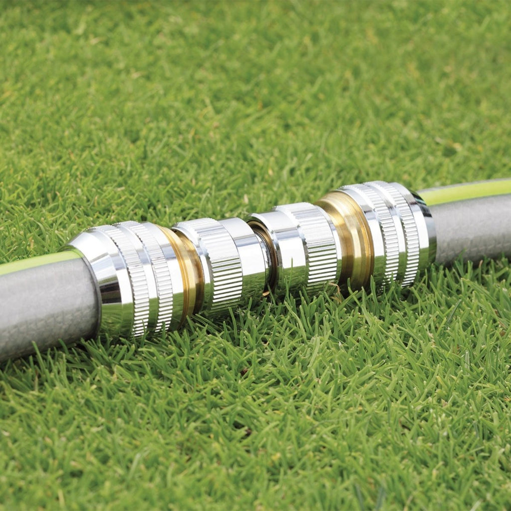 This two-way hosepipe connector connects two hoses using automatic Quick-Click couplings. Made from chrome-plated brass, it offers good weather resistance, and rubber washers ensure a perfectly watertight fit.
