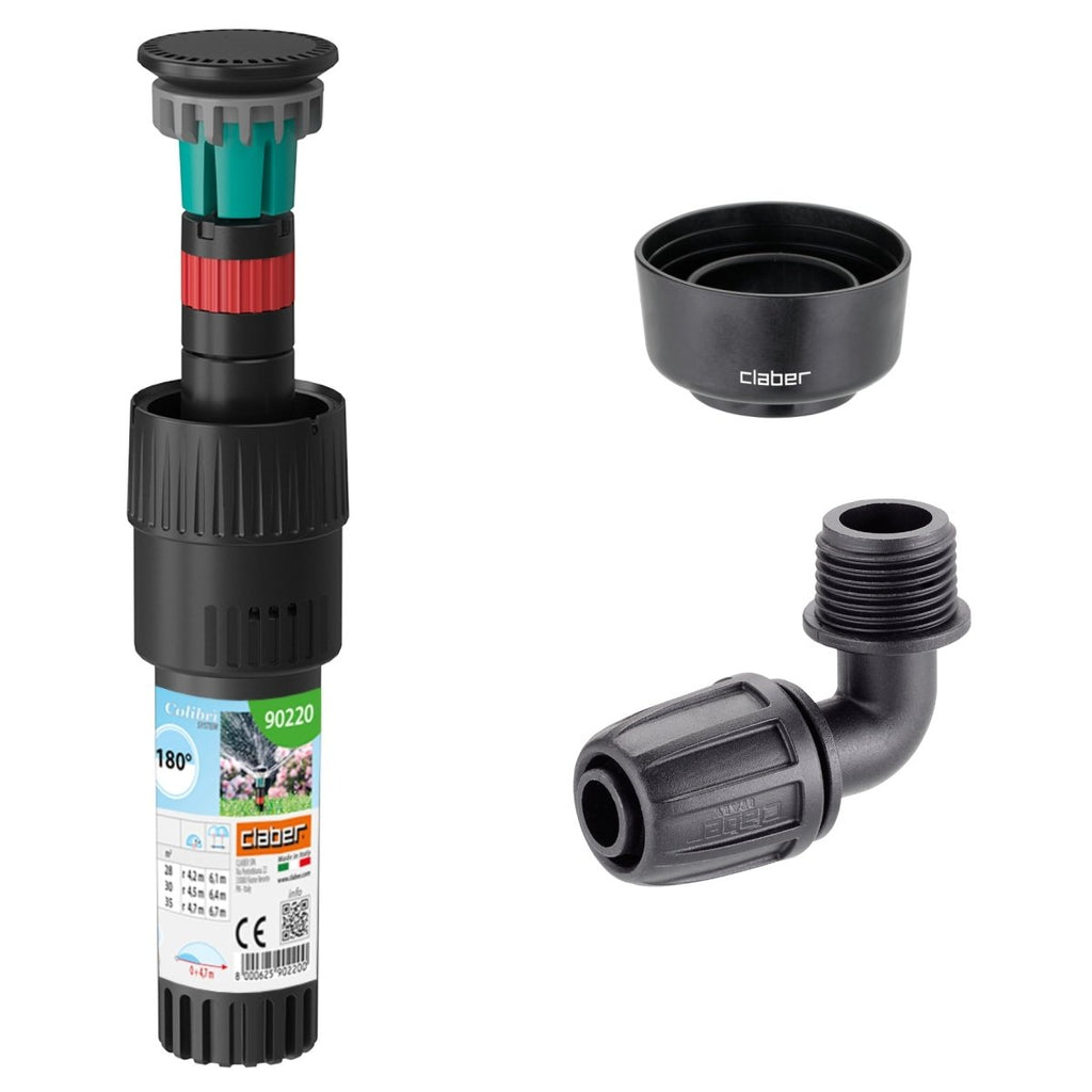 This bundle is perfect for creating a Pop-Up sprinkler irrigation system. It contains a 180° Claber 90220 Colibri pop-up micro sprinkler, a collar guard to help protect the sprinkler head from debris, and a threaded elbow compression connector. With its low water consumption, the underground micro-sprinkler is ideal for watering small lawns and gardens, even at low pressure. The sprinkler has an external adjustment of the watering range. It provides a gentle rain effect over a 180° semi-circular area. Height from ground: 2” (5 cm). For use with a 1/2-inch (12-16mm) hosepipe/main tube. The sprinkler is made of ABS (acrylonitrile butadiene styrene), a common thermoplastic polymer. The bundle contains a Claber 90220 Pop-Up Micro Sprinkler, a Claber 90250 Collar Guard, and a Claber 91019 threaded elbow connector.